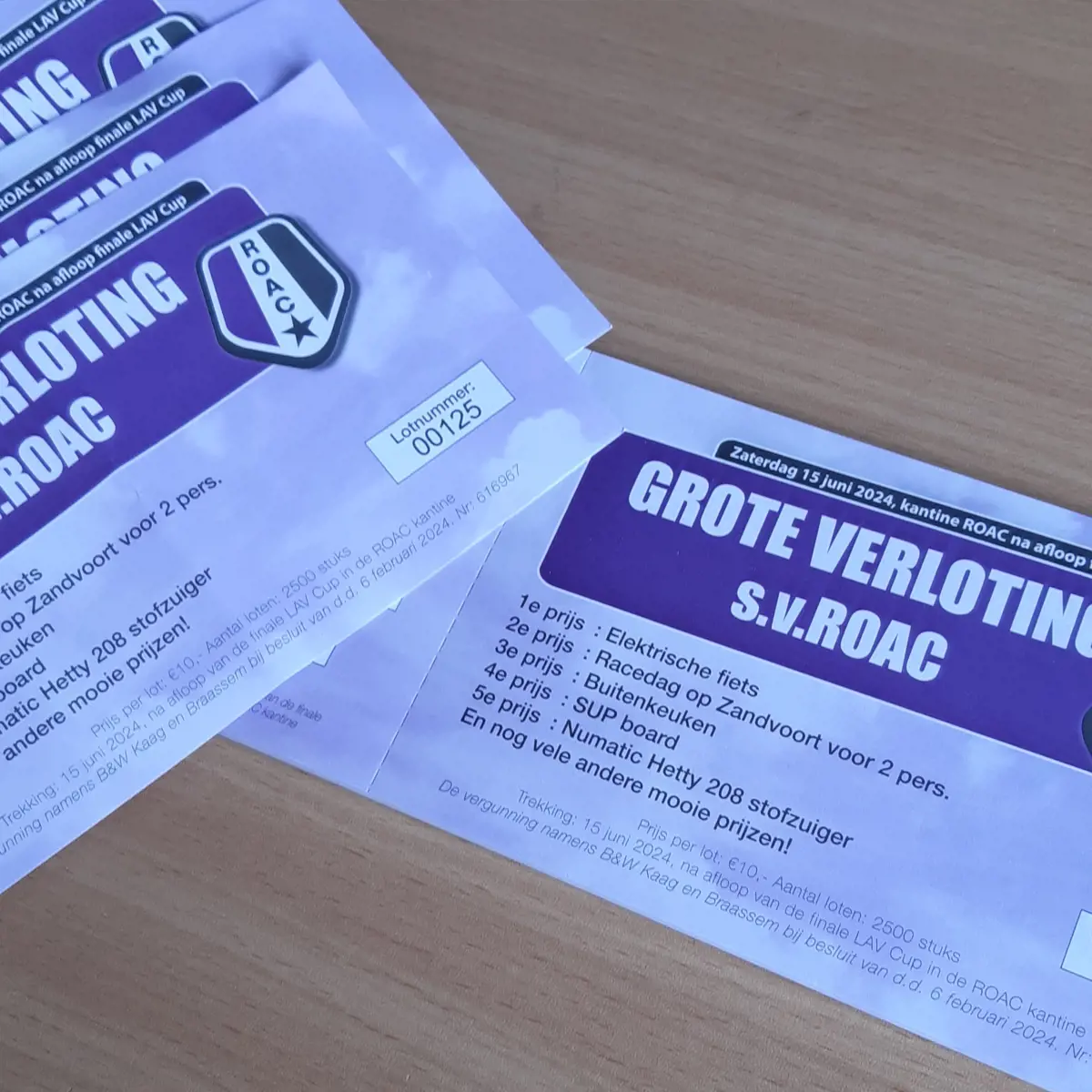 Tijdens de kavelveiling op 8 maart is de verkoop van de loterij gestart. Tijdens thuiswedstrijden van ROAC 1 en tijdens evenementen zoals de Jeugdolympiade, lopen verkopers rond bij wie je loten kunt kopen. Geen verkoper gezien, maar wil je wel loten kopen? Spreek dan Rob van der Hoorn, Walter Koek, Sabine van Velzen, Frans de Haas, Jur Semp, Jacqueline Boere of Inge van der Hoorn aan of stuur een mailtje naar veilingroac@gmail.com.
