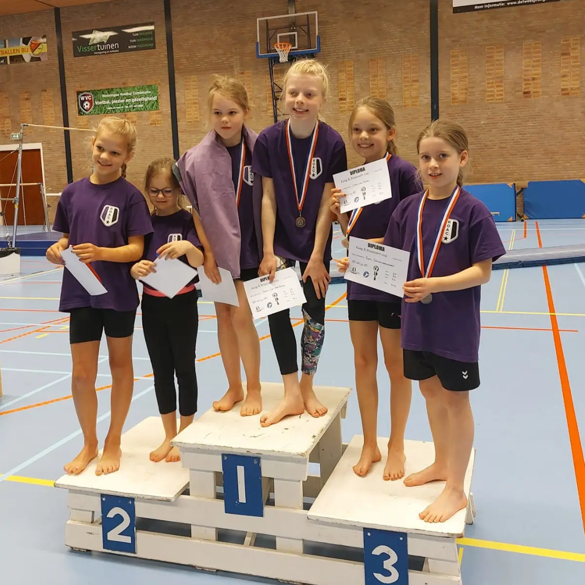 Maar liefst 6 van de 11 ROAC-deelnemers zijn gisteren in de prijzen gevallen bij de Kaag & Braassem Gym Cup. Dat is een hele goede score. Trainster Caroline heeft met de kinderen een mooie prestatie geleverd, ondanks de rugproblemen waar ze de laatste tijd mee te kampen heeft. Het was goed dat ze vroeg in het seizoen waren begonnen met het oefenen voor de wedstrijd.
